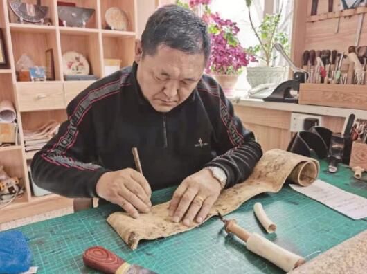 “觸網(wǎng)”是萬德順應(yīng)時(shí)代的一次嘗試,也是他手工皮藝之路的又一次轉(zhuǎn)型。12歲時(shí),他從馬背上摔下來,在舅爺家休養(yǎng)時(shí)第一次接觸到皮雕,并與皮雕結(jié)下不解之緣。42歲時(shí),萬德在手術(shù)中發(fā)生意外導(dǎo)致癱瘓。經(jīng)歷了迷茫、絕望的他,決定重拾老祖宗留下的手工皮藝,在輪椅上把傳承家族皮雕手藝作為后半生奮斗的事業(yè)。