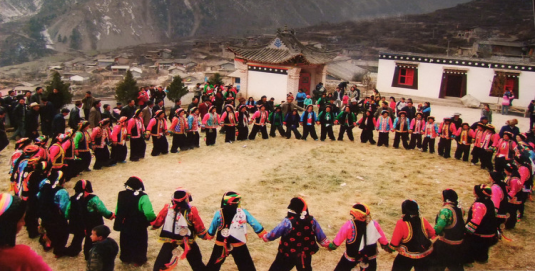多地舞的動作以腰以下部位為多,經(jīng)常出現(xiàn)“一順邊”的美,即手和腳同出一側形成“一順兒”。許多舞蹈中女性以身體俯仰、臀體轉動為特色,顫膝擺胯,微動肩胸,上身較為平穩(wěn),上肢開張幅度不大,合著腳步和節(jié)奏律動,較為突出地表現(xiàn)了女性胸部之凸顯、腰部之柔軟、臀部之豐腴。舟曲藏民族的女性舞姿顯出了山地藏民族腆靜、文雅、內(nèi)秀的性情。