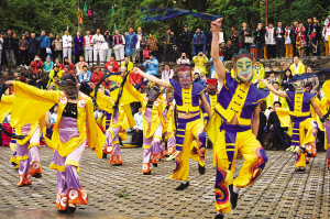 圖①為祭師們手捧獻(xiàn)給祖先的瓜果、茶、酒,等待儀式開(kāi)始。圖②為在樂(lè)祭中,祭師們跳起歡快的娛神舞。