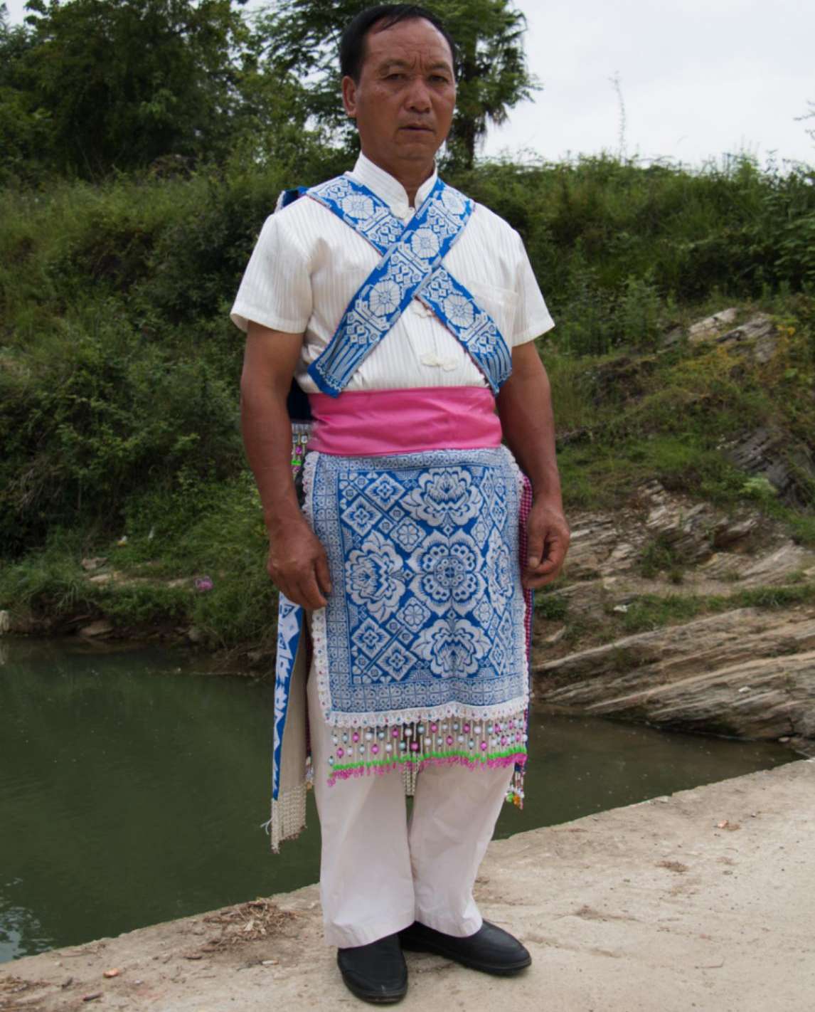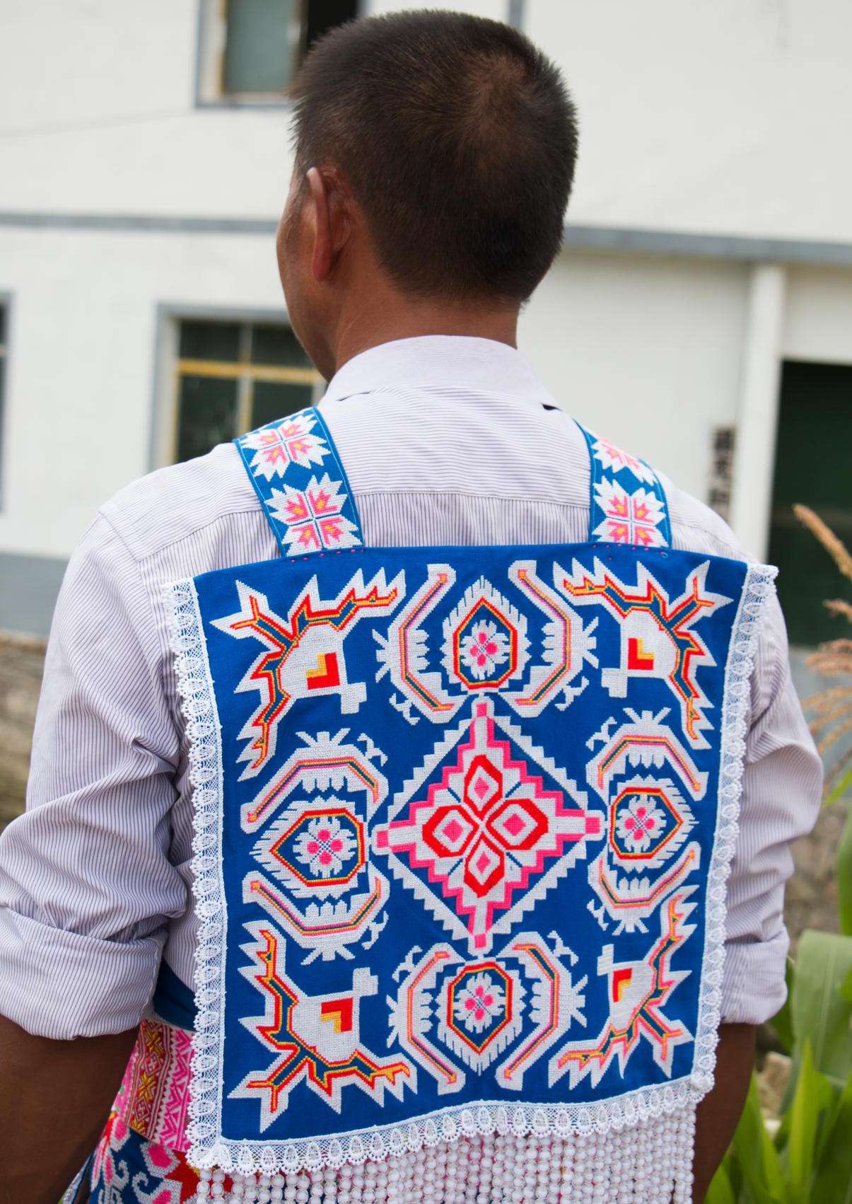 谷立村男子服飾相對于苗族女子服飾則顯得較為簡樸,男子上身主要穿著白色打底的對襟衣,身后背有背牌,背牌底色為藍(lán)色,上繡有花朵圖案作為裝飾。下身主要以藍(lán)色打底的圍裙為主,身前圍裙,上面布滿刺繡圖案。身后的圍裙則為一條條獨立的絲帶,絲帶上同樣布滿花紋刺繡圖案,在其底部還串有珠簾作為裝飾。