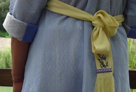 斜襟短衣外的圍腰上部與斜翼兩側鳥獸花紋,圍腰大部分為純色,色彩選擇較多。而垂在腰后的彩帶尾部有流蘇,助以美觀和裝飾。