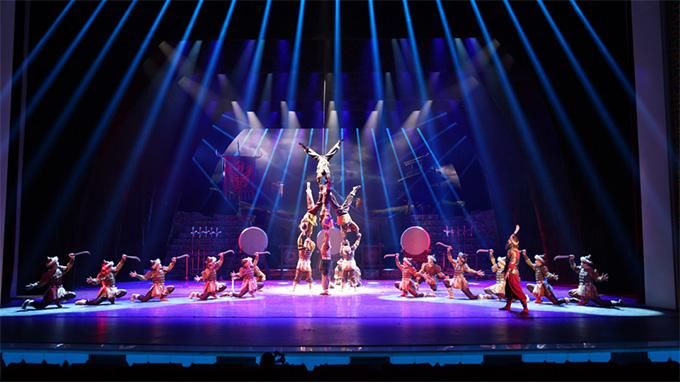 雜技成為劇目的加分項(xiàng)。雜技節(jié)目是新疆生產(chǎn)建設(shè)兵團(tuán)雜技團(tuán)的拿手好戲,但主創(chuàng)團(tuán)隊(duì)在編創(chuàng)時(shí),并沒有將該團(tuán)過去的金獎(jiǎng)節(jié)目直接照搬,而是根據(jù)劇情巧妙地進(jìn)行了取舍,將原先完整的雜技節(jié)目分解成一個(gè)個(gè)獨(dú)立的動(dòng)作技巧,根據(jù)主題表達(dá)、人物塑造、情節(jié)起伏、矛盾變化等劇情發(fā)展需要進(jìn)行重新整合,使雜技獨(dú)特的個(gè)性在表演中發(fā)展為主題性、戲劇性、語言性的藝術(shù)。用集體倒立技巧表現(xiàn)沙漠中千姿百態(tài)的胡楊造型;用急促迅捷、富于變化的繩技表現(xiàn)戰(zhàn)爭(zhēng)中策馬揚(yáng)鞭、軍情緊急的場(chǎng)面;用女子集體造型表現(xiàn)宮廷夜宴時(shí)的曼妙繁盛、歌舞升平等……雜技元素在劇中的巧妙運(yùn)用,成為全劇錦上添花的亮點(diǎn),體現(xiàn)出“有舍才有得”的大智慧。