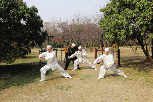 顏勇(中,穿黑衣者)指導(dǎo)回族青年習(xí)練晰揚(yáng)掌