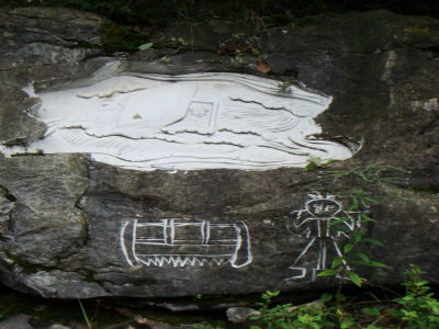 筆者在該村所見的具有“文化生態(tài)村”建設(shè)痕跡,除了村口巨石上鐫刻的文字外,還修建了一條貫通項目組專家們規(guī)劃的“文化生態(tài)展示區(qū)”的石板路,并在作為展示重要文化景觀的地方豎立了介紹或解釋性的文字標牌。如,村口、山神廟前、摔跤場等都立有介紹的招牌。讓筆者疑惑和認為不應該“改造”的是在村民們的祖靈洞巖壁上的“藝術(shù)石刻”(見圖)。從筆者與村民的訪談和項目組的總結(jié)報告資料中,可以把文化生態(tài)村建設(shè)試點項目組在月湖開展的文化保護工作歸結(jié)為如下幾個方面: