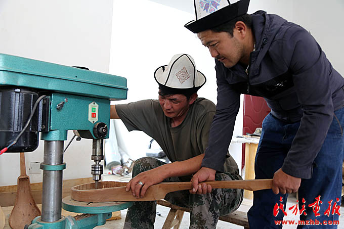 這間工作室的主人叫阿吉別克·買買達(dá)洪,主人恰巧有事外出,他的弟弟,年輕朝氣的吾蘭別克張羅著給記者們當(dāng)起了翻譯。正忙活著打磨樂器的小伙叫木沙,今年31歲,問起庫姆孜的制作工藝,他才把頭抬起來,笑著說:“我做這個十年了。一把庫姆孜,往往琴身是杏木,蓋子是松木。杏樹、松樹木切割后放在干燥的地方,一兩年后才能用?!睅炷纷斡腥遥傧乙郧坝脛游锏哪c子手工自制,現(xiàn)在有的工匠開始使用現(xiàn)成的弦。判斷庫姆孜手工藝人手藝高低的關(guān)鍵何在?木沙解釋說,“要看彈出來的聲音。木頭的原料不同,出來的聲音也不同?!边@個回答似乎也隱藏了手工藝人的絕活所在,可意會不可言傳的技藝,往往在一代代的工匠手中以師徒親授的方式傳承。