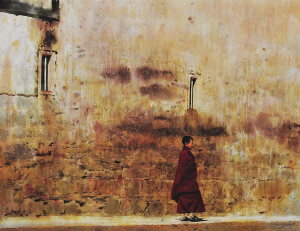 在麗江的束河古鎮(zhèn),他坐在小溪邊,吹著清涼的微風(fēng),聽著對面咖啡屋傳來的低吟慢唱,心情舒暢地畫著自己的畫。很快,一幅《水邊咖啡屋》就在這不經(jīng)意間誕生了。在梅里雪山,早晚都能看到人們所說的日照金山的美景,打開窗戶,暖陽透進來照在身上,就這樣畫著藏族人心中的神山,他覺得實在找不出還有比那一刻更美好的感覺了。