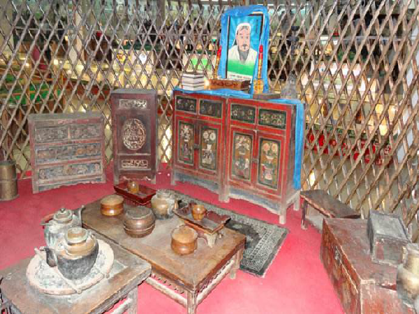 亞洲游牧、游獵民族創(chuàng)造的移動式民居,在其發(fā)展過程中形成了兩大流派:一種是中國鄂倫春人的傳統(tǒng)建筑歇仁柱式(在鄂倫春語里歇仁柱為“木桿屋”之意),即尖頂、用獸皮或樹皮、草葉子做苫蓋。另一種是蒙古包式的,即穹頂圓壁,主要用毛氈做其覆蓋物。蒙古包的包門開向東南,既可避開西伯利亞的強冷空氣,也沿襲著以日出方向為吉祥的古老傳統(tǒng)。而帳內(nèi)的中央部位,安放著高約二尺的火爐?;馉t的東側(cè)放著堆放炊具的碗櫥,火爐上方的帳頂開有一個天窗?;馉t西邊鋪著地氈,地氈上擺放矮腿的雕花木桌。包門的兩側(cè)懸掛著牧人的馬鞭、弓箭、獵槍以及嚼轡之類的用具。帳內(nèi)的西側(cè)擺放著紅漆彩繪木柜,木柜的北角上敬放著佛龕和佛像,佛像前供放著香爐及祭品。