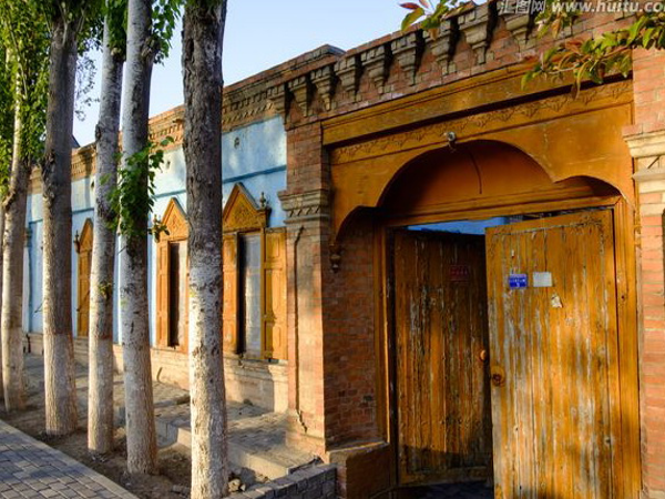 維吾爾族的居室一般是土木結(jié)構(gòu)平房,其建筑方式是以粗木或沙石作基,土塊砌墻,或笆子墻,房頂架梁檁、椽后鋪葦席加土抹泥。房屋平頂,開天窗采光,四壁不開窗只留門,房門忌朝西?,F(xiàn)在,建筑式樣發(fā)生變化,多留壁窗,建材也多由土木結(jié)構(gòu),向磚、混凝土結(jié)構(gòu)發(fā)展。室內(nèi)布置過去較為簡(jiǎn)單,一般多砌土炕,炕一側(cè)隔矮墻砌鍋臺(tái),墻上留有壁翕,放置物品,喜掛壁毯。冬季多燒爐子、火墻取暖。院內(nèi)多植有葡萄和果樹花卉。房門口兩側(cè)砌土臺(tái),上鋪氈毯,用以夏天乘涼、睡覺。