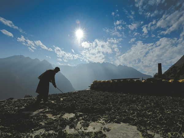木上村的3個寨子有80多間房屋,分上中下依山而建,海拔2000多米,呈梯級分布。房屋是由石塊和泥土堆砌而成,整個寨子的色調(diào)和背后的大山融為一體,村民們屋頂上晾曬的玉米點綴其間。