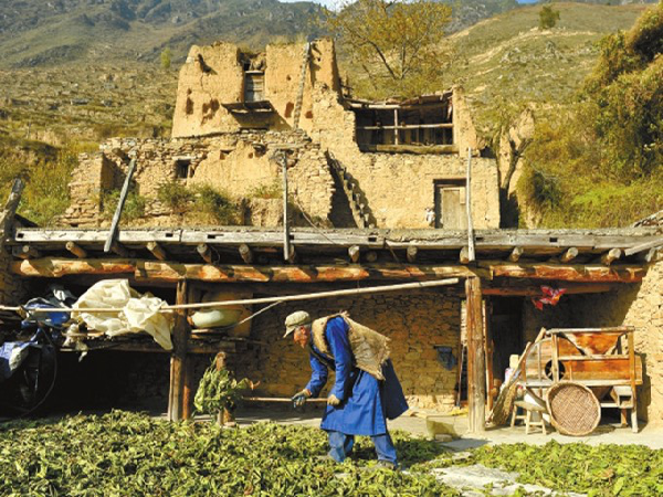 68歲的楊慶平在屋頂上晾曬煙葉,遠處矗立著地震中唯一保存完好的碉樓