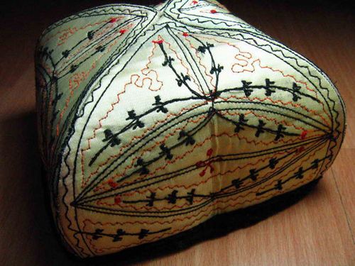 新疆兄弟民族的帽子,顏色、帽形是多種 多樣的,最典型的是維吾爾人的綠花帽。它是用手工、絲線繡上花葉圖案的四方棱形的花帽,繡工精致,花葉紋樣富有裝飾美。顏色有綠、紅、黃、黑、白。有單色的,也有無(wú)色交織的、黑白相間的。這種花帽,男女老少都愛(ài)戴,但顏色花樣有所不同。男士戴的多繡花,婦女戴的不但繡花,而且在花紋中鑲上玻璃珠子或碎玉石片。