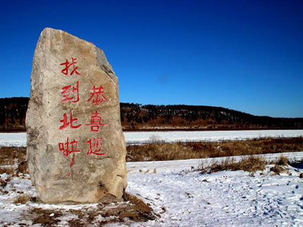 沿著形態(tài)各異的“北”字,可以走到中國(guó)最北端的廣場(chǎng)——北望埡口?!皷|經(jīng)122°20'43。48〃E北緯53°29'52。28〃N”的標(biāo)志就立在這里,旁邊一塊巨石上刻著“中國(guó)北極點(diǎn)”。