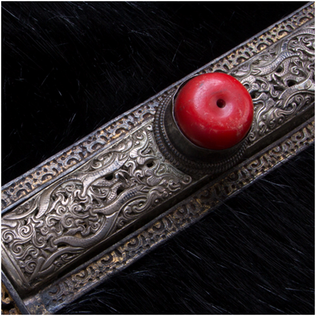 康區(qū)人性格粗獷豪放,刀對(duì)于他們來(lái)說(shuō),主要是戰(zhàn)斗的武器,他們愛(ài)刀勝過(guò)愛(ài)牛羊,一把好刀就是一筆財(cái)富,其形象也會(huì)因之而無(wú)形中高大起來(lái)。正因?yàn)槿绱耍麄儾粌H對(duì)刀本身有較高的要求,對(duì)其作為襯托武士氣概的刀的外在形制也有特殊的喜好。刀鞘材料一般使用黃、白銅或純銀,鑲珠嵌寶,正面雕龍畫(huà)鳳,背面線刻卷草,佩在身上,起到了美觀和威懾的雙重作用。