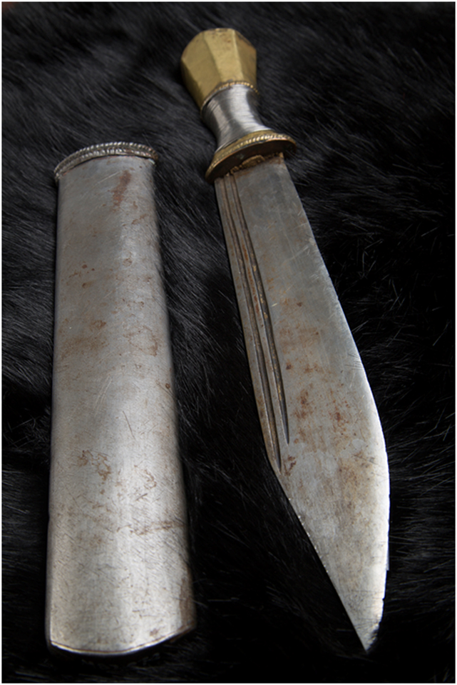 地處藏東的林芝地區(qū)一帶,也叫貢布地區(qū),居住著藏族、門(mén)巴族和珞巴族,這里山高林密,野獸出沒(méi)其間,靠山吃山,人們伐薪狩獵是家常便飯。所以人們使用的刀具以寬、長(zhǎng)為多。刀鞘多為木質(zhì),外面用獸皮包裹,一般是用野獸腿骨上的皮,有些還帶有爪子。外在裝飾主要是附在獸皮上的毛色和趾爪。其用途除了捕獵格斗,更是人們?cè)诿芰种信G斬棘的利器。