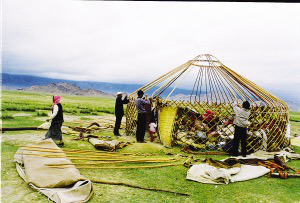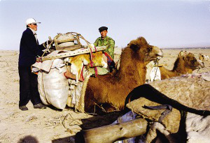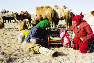 每戶人家的家就在那三四頭駱駝的背上,駱駝的先后排列也是有講究的。一般第一峰駱駝負責運被褥,婦女和小孩也坐第一峰駱駝。后面的駱駝則運衣服、日用品、食物、氈房的羊毛氈和氈房骨架。家里的男人們則騎著馬,趕著大群的牛羊緊跟在后面。平時來往較少的牧民們因為轉(zhuǎn)場,有了歡聚的機會。每天下午,牧民們就開始在路上安營扎寨,男人們開始從駝背上卸下氈房,在路邊搭建臨時簡易氈房;女人們生火煮飯,孩子們成群地奔跑嬉鬧,每家的牧羊狗或打架或形影不離。緩緩的炊煙在金色的黃昏中飄散,男人們開始圍在篝火旁喝酒唱歌,火光映紅每一張黝黑的臉龐,悠遠的歌聲在空曠的夜空飄蕩。