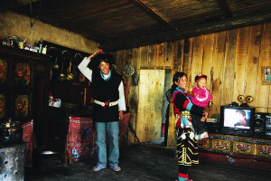 在珞巴族家中,男主外,女主內(nèi),分工相當(dāng)明確。當(dāng)達(dá)瓦在家里和我聊天時(shí),他的妻子群宗一直在忙碌著,忙著給我打酥油茶,忙著生火燒水、煮土豆,忙著照顧孩子。為了讓我能拍一張達(dá)瓦一家人穿珞巴族服裝的照片,大家費(fèi)了好大勁兒。他們從東家借來(lái)帽子,從西家找來(lái)褂子,也有從南家借來(lái)的飾品……終于,達(dá)瓦和群宗夫妻倆都穿戴上了本民族的服飾,我如愿以償?shù)亟o他們拍了一張全家福。