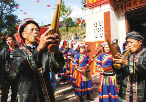 獨(dú)具瑤族特色的吹笙跶鼓舞。