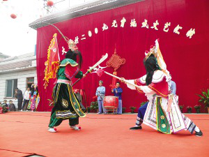 與屯堡地戲一樣,大寨布依地戲劇目的內(nèi)容大多取材于歷史演義和民間傳說中金戈鐵馬的英雄故事。與屯堡地戲相比,大寨布依地戲表演者身上沒有了屯堡地戲里那充滿尚武之氣的盔甲戰(zhàn)袍,取而代之的卻是具有布依風(fēng)格的藍(lán)衫長褂,桃花裝飾,古樸中透出優(yōu)美。劇中的女角都是男扮女裝,粗獷、豪邁的精彩打斗中,不時(shí)有輕柔的表演成分。整臺表演斗中有舞,以唱代言。唱段短小精悍,與屯堡地戲相比更多了舞臺的戲劇觀賞效果。