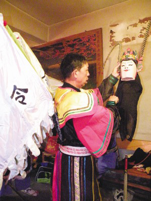 請“臉子”是地戲表演時(shí)一個(gè)非常講究的開場儀式?!巴捅さ貞颉钡恼埬樧觾x式通常是整個(gè)戲班子的人都必須參加祭拜。表演時(shí)必須鄭重地從箱子里請出珍藏的“臉子”,“臉子”才具有神的靈性??墒俏覀兛吹降拇笳家赖貞?,在保持傳統(tǒng)的同時(shí)又不失自己的個(gè)性。通常請“臉子”是由當(dāng)?shù)亻L老一個(gè)人完成所有的祭拜過程,一切都是那么簡單。祭拜中都是用當(dāng)?shù)氐牟家涝掓告傅纴?,這樣的表演給它增添了別有的韻味。