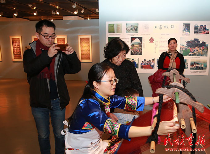 座談會上,中國民族博物館副館長張志文介紹說:土家族是一個古老的民族,有著4000多年的文明發(fā)展史。土家族在全國有2個自治州、8個自治縣,人口達835萬。土家織錦從秦漢時期萌芽,歷經(jīng)賨布、溪布、斑布、土錦等幾個發(fā)展階段,在明、清時期開始定型,至今已有2000余年的燦爛歷史。中紀委駐財政部紀檢組原組長、全國婦女手工編織協(xié)會副會長賀邦靖說:土家織錦是土家婦女智慧的結(jié)晶,是武陵山區(qū)文化精準扶貧的重點項目之一。從這個展覽上我們不僅可以看到土家織錦的燦爛與美麗,還可以看到國家實施文化精準扶貧的實效。