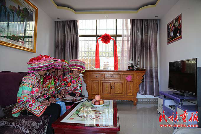 搬到新村后,村民們的生活多了幾分樂趣。村民張曉倩(右二)拿出自己的結(jié)婚照與姐妹們分享這個(gè)幸福的瞬間
