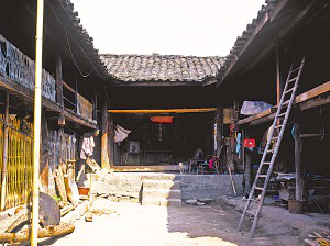 廚房大都在左間,地中間橫砌土臺(tái)鍋灶,上面是兩口大鐵鍋??亢髩κ谴毒摺⒉途?,前面是石碓,平時(shí)搗豬飼料,節(jié)日搗粑粑,用石碓搗的辣椒面也格外好吃。右間大都是家長的居室,只放木床。兩側(cè)廂房與主房分離,木板梯上下。一側(cè)下層是豬圈、牛欄,上邊存干草;另一側(cè)下面堆放糧食、燒柴、摩托車,上層是未婚子女的臥室,有廊道、腰欄。院落小的,在主房對(duì)面設(shè)牛欄,砌土坯墻圍成獨(dú)立的合院。