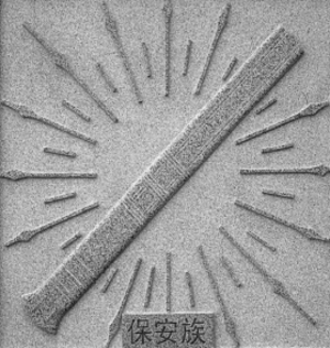 保安族擅長(zhǎng)打刀技術(shù),所產(chǎn)刀具構(gòu)造精巧、質(zhì)量上乘,工藝獨(dú)成一體,被稱(chēng)為“保安腰刀”。保安人打制腰刀具有800多年的歷史,公元13世紀(jì)成吉思汗東征時(shí),把部分來(lái)自中亞的官兵和工匠留在青海同仁地區(qū)。這部分色目人與當(dāng)?shù)孛晒?、漢、回、藏、土等民族相鄰而居,相互交流融合,逐步形成了今天的保安民族。保安族發(fā)揮擅長(zhǎng)冶鐵技術(shù)的特長(zhǎng),所生產(chǎn)的腰刀不僅自用,還成為與蒙古、藏、回等民族交換牛羊和日用品的商品,因此逐漸聞名于世。
