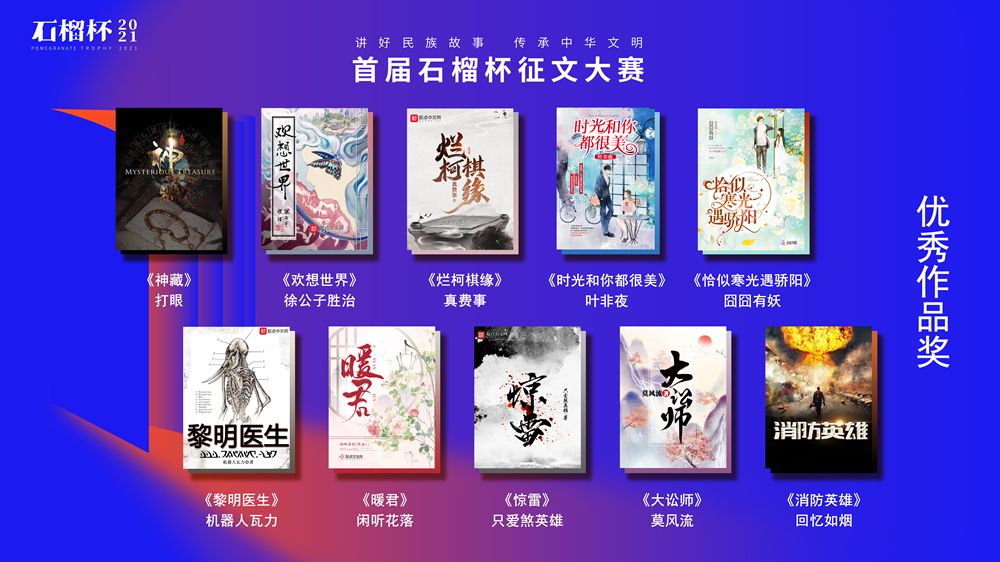 6月19日,民族題材網(wǎng)絡(luò)文學(xué)創(chuàng)作論壇暨首屆石榴杯征文大賽頒獎典禮在京舉行。作為國家民委主辦的“中華民族全家?!毕盗谢顒又唬讓檬癖魑拇筚惖玫搅藝颐裎幕麄魉竞椭袊贁?shù)民族文化藝術(shù)促進(jìn)會的指導(dǎo)與支持,由閱文集團(tuán)聯(lián)合天成嘉華文化傳媒、中國民族文化資源庫、中國民族文化資源網(wǎng)共同舉辦。本屆大賽以“講好民族故事 ,傳承中華文明”為主題,涌現(xiàn)出眾多弘揚(yáng)民族精神、表達(dá)文化自信、傳播正能量的作品。經(jīng)過專家推薦及嚴(yán)格評審,《草原有座蒙古包》、《走西口之天山行》、《彩云微光》等三部作品獲“最具民族風(fēng)采獎”,《神藏》、《歡想世界》、《爛柯棋緣》、《時(shí)光和你都很美》、《恰似寒光遇驕陽》、《黎明醫(yī)生》、《暖君》、《驚雷》、《大訟師》、《消防英雄》等十部作品獲“優(yōu)秀作品獎”。所有獲獎作品都將收錄入中國民族文化資源庫。中國作家協(xié)會副主席、書記處書記吉狄馬加表示,本屆石榴杯大賽是在黨和國家長期以來堅(jiān)持的對民族文化、少數(shù)民族作家創(chuàng)作和民族題材創(chuàng)作的大力扶持下,依托網(wǎng)絡(luò)文學(xué)平臺,將文學(xué)作品與影視作品改編、游戲、動漫產(chǎn)品制作結(jié)合起來,探索的一條發(fā)展民族文化的新路,具有開創(chuàng)意義。