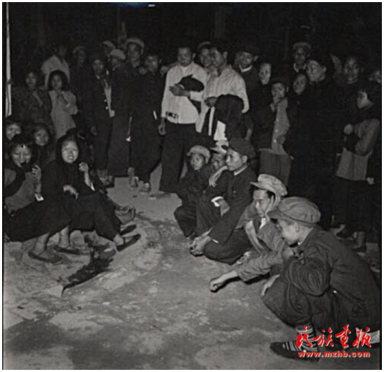 “歌圩”是桂西壯族古老的風(fēng)俗。每年農(nóng)歷正月、二月、四月都有歌圩日。圖為1957年廣西壯族自治區(qū)憑祥市郊區(qū)的歌圩日,這里不但處處歡歌笑語,還有搶花炮、演壯戲、舞彩龍、舞彩鳳、唱桂劇等很豐富的文娛活動