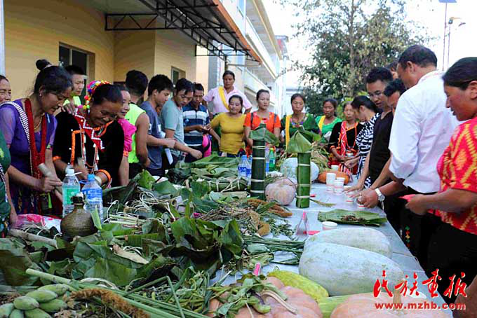 尚立文向記者介紹說:“以前景頗族過年,大年三十,一部分男人在家殺年豬,其余的就上山打獵。景頗族很慷慨,凡是獲取到的獵物,見者都有份。女人除了在家準備年夜飯,也會上山或下壩子采野菜等。但不管是打獵的還是摘野菜的,都必須在太陽落山前到家,闔家歡度春節(jié)吃年夜飯?,F(xiàn)在生活好了,不打獵不摘野菜了,但還是得遵循太陽落山之前到家的習俗?!?/p>