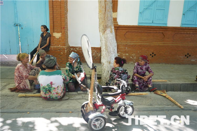 走在喀贊其街頭,可以看到穿著鮮艷花色連衣裙的維吾爾族婦女、扎著漂亮方形頭巾的哈薩克族姑娘、戴著白色圓帽的回族老漢……如同觀看一場(chǎng)民族服裝表演。圖為喀贊其老街上的“悠閑時(shí)光”。