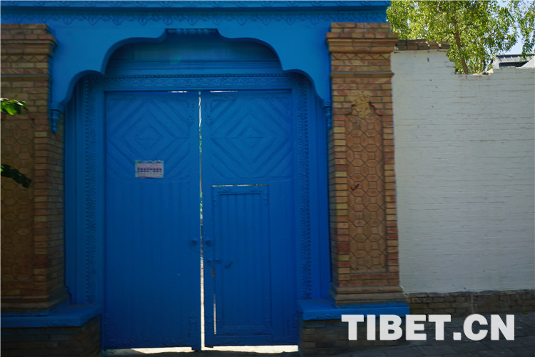 目前,喀贊其仍保留著一定數(shù)量的文物古跡,包括自治區(qū)級(jí)文物保護(hù)單位1個(gè)(陜西回族大寺),市級(jí)文物保護(hù)單位7個(gè),另有12處清真寺建筑。圖為具有當(dāng)?shù)靥厣呐R街藍(lán)色大門。