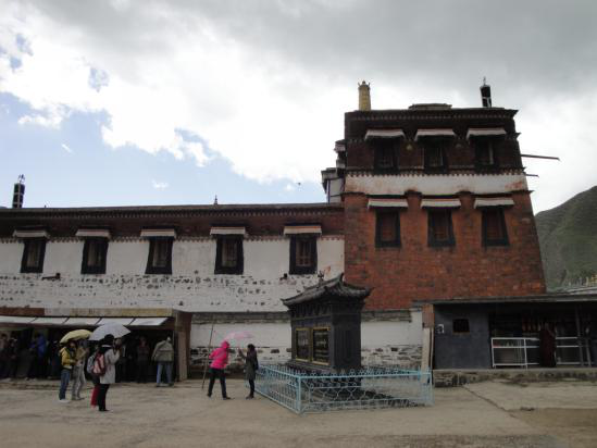 在狹長(zhǎng)的盆地上,各式建筑星羅棋布,金瓦紅墻,雕梁畫棟,華麗非凡。僅圍墻就長(zhǎng)達(dá)3公里余。五百多間連續(xù)回廊及一千多個(gè)“嘛呢轱轆”,將寺院與外界隔絕。整個(gè)寺院外部墻垣、院地、臺(tái)階均以石砌為主,內(nèi)部戶限、柵欄、棟梁、門栓均以木料為主,故有“寺院外不見木,內(nèi)不見石”的說(shuō)法。