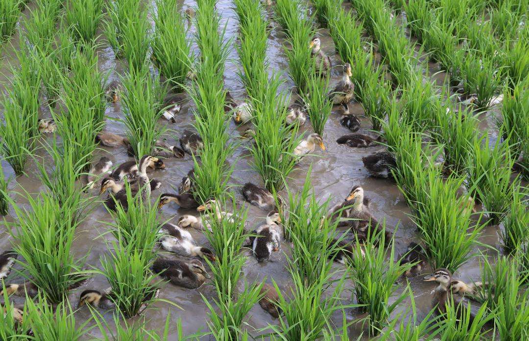 除了科技富硒外,過灣富硒米還采用了稻鴨共作的種植技術。鴨子以天然水草和水生物為食,免去除草劑的使用,直接代替人工解決了除草和除蟲。同時,鴨子在稻田間游動不僅加強水稻根部的空氣流動,促進水稻的呼吸作用,同時也可以耙田濁水,促動水田流動,疏松土壤,刺激水稻生長。鴨糞落入稻田也是天然有機肥,給水稻補充天然養(yǎng)料。因此這種稻鴨共作的方式不僅利于環(huán)境的保護,也可以在適當提高水稻產(chǎn)量,利于鴨子的生長,形成有益的生態(tài)循環(huán)。