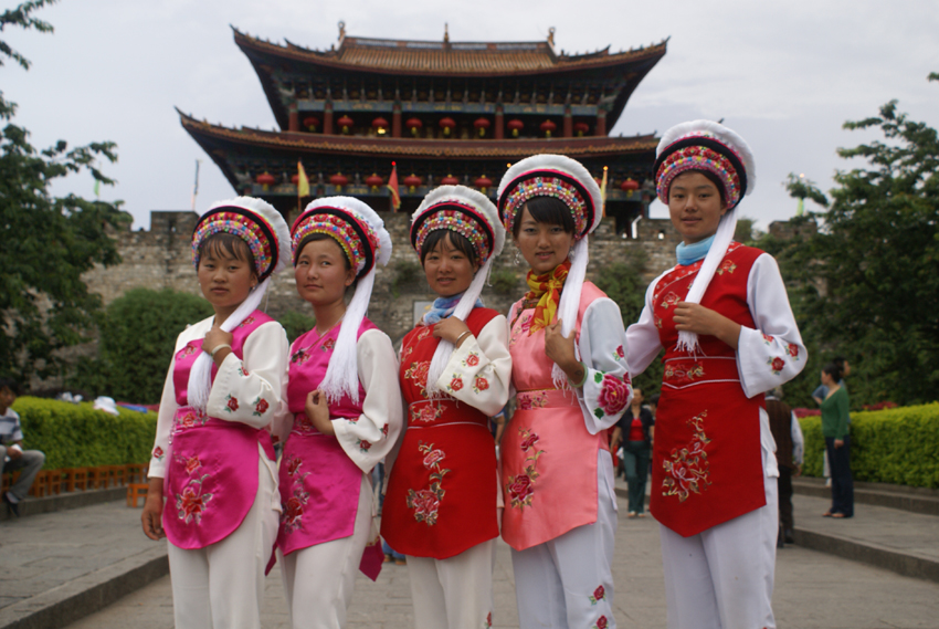 一直以來,享有“金花”美譽(yù)的白族婦女的服飾,更是色澤鮮美、絢麗多彩。大理一帶的婦女多穿白上衣、紅坎肩或是淺藍(lán)色上衣配絲絨黑坎肩,右衽結(jié)紐處掛“三須”“五須”的銀飾,腰間系有繡花飄帶,下著藍(lán)色寬褲,腳穿繡花的“白潔鞋”。手上多半戴紐絲銀鐲、戒指。已婚婦女梳發(fā)髻,未婚少女則垂辮或盤辮于頂,有的則用紅頭繩纏繞著發(fā)辮下的花頭巾,露出側(cè)邊飄動(dòng)的雪白纓穗,點(diǎn)染出白族少女頭飾和發(fā)型所特有的風(fēng)韻。劍川一帶的年輕女子則又喜戴小帽或“魚尾帽”。洱源西山及保山地區(qū)的白族婦女常束發(fā)于頂,上插銀管,再以黑布包頭,穿右襟圓領(lǐng)長衣,系繡花腰帶,衣袖和褲腳喜鑲繡各色寬窄不同的花邊,有的還喜束護(hù)腿,顯得十分勻稱協(xié)調(diào)和俊俏美觀??傊?,各地白族的服飾雖呈現(xiàn)出某些地區(qū)性的差異,但都色彩明快、映襯協(xié)調(diào)、挑繡精美、古雅端莊。