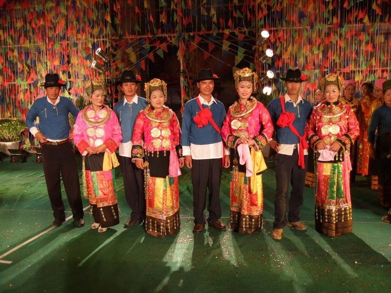 主婚人念完祝詞以后,新郎、新娘各在桌上揪下一團(tuán)糯米飯,蘸點(diǎn)米酒、食鹽、舂鹽捧、芭蕉后擺在桌前。主婚人拿起一條長(zhǎng)長(zhǎng)的白線,從左至右纏在新娘、新郎的肩背,將白線兩端搭在“茂歡”之上,表示將一對(duì)新人的心拴在一起。然后再拿兩縷白線,分別纏在新郎、新娘的手腕上,祝愿新婚夫婦百年好合,無(wú)災(zāi)無(wú)難。在座的長(zhǎng)者也各拿兩縷白線,分別拴在新郎、新娘手上,邊拴線,邊念些祝愿詞。拴完線后,婚儀基本結(jié)束,婚宴開始,新郎新娘向賓客敬酒致意。