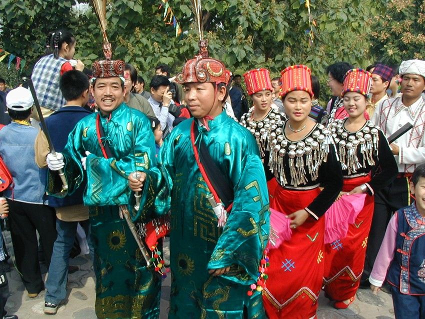 目瑙節(jié):又稱“總戈”,景頗語音譯,意思是“大伙跳舞”。目瑙節(jié)是景頗族最盛大的傳統(tǒng)節(jié)日,一般于每年農(nóng)歷正月十五以后的九天內(nèi)擇雙日舉行,節(jié)期三至五天不等。目瑙作為一種大型的群眾性歌舞活動,由來已久,歷史上,每逢豐年,出征、凱旋、婚姻嫁娶、敬祭鬼神等重要活動,均要跳“目瑙”。景頗族的“目瑙縱歌”原來是一種融宗教和文化習(xí)俗為一體的傳統(tǒng)慶典。隨著社會的發(fā)展,逐漸演化為各種不同類別的“目瑙”。大致有以下幾種:①“歲目瑙”,家庭財(cái)源茂盛,人丁興旺時(shí)舉行;②“布當(dāng)目瑙”,征戰(zhàn)取得勝利時(shí)舉行;③“貢冉目瑙”,同胞兄弟分家自立門戶時(shí)舉行;④“騰肯目瑙”,新建房屋住所落成時(shí)舉行;⑤“空然目瑙”貴族家娶親辦婚禮時(shí)舉行;⑥“達(dá)如目瑙”,出征時(shí)舉行;⑦“昔目瑙”,有名望的長者去世送葬時(shí)舉行;⑧“柱目瑙”,祭奠“木代”神時(shí)舉行。不同類別的“目瑙”都有特定的內(nèi)容和表現(xiàn)形式,但有一個(gè)共同點(diǎn)就是整個(gè)過程都是由“瑙雙”(領(lǐng)舞)隊(duì)和“瑙巴”(表演)隊(duì)組成的舞隊(duì)來表現(xiàn)和完成的。每逢目瑙節(jié)日,村村寨寨的景頗人身著節(jié)日盛裝,紛紛從四面八方涌入目瑙廣場。廣場上人山人海,氣氛熱烈歡快而不失莊嚴(yán)古樸的特色。廣場中央高豎著四根長約4米的目瑙柱,亦稱雌雄柱,中間兩根為陰,外面兩根為陽,上面皆繪有精美而富有象征意義的圖案:右邊柱上往往繪以蕨菜花紋,象征團(tuán)結(jié)奮進(jìn);左邊常畫回紋構(gòu)成若干個(gè)四方形,并涂以不同顏色,表示景頗族的遷徙路線;中間兩根柱子之間,交叉著兩把長刀,為景頗民族驍勇強(qiáng)悍、堅(jiān)強(qiáng)剛毅性格的具體標(biāo)志。目瑙柱的左側(cè)立著一個(gè)方形架子,上層是吹嗩吶的座位;前面掛著一個(gè)兩米長的大皮鼓和一面直徑一米多的大芒鑼,供跳舞時(shí)伴奏用。廣場四周用竹籬笆圍起,目的是為了防止野鬼的侵入和牲畜的干擾。舞蹈開始時(shí),鼓樂齊鳴,由兩位德高望重且又熟悉目瑙舞路線的老人身穿大龍袍,頭戴飾有孔雀、野雞羽毛和野豬牙齒的目腦帽,手持長刀領(lǐng)頭,后面跟著背銅炮和持長刀的隊(duì)伍,婦女們拿著扇子或彩帕跟在最后,邊歌邊舞,熱鬧非凡。參舞者少則百多人,多則幾千人,從清晨到日暮,以日暮到清晨,通宵達(dá)旦,其間舞者跳累時(shí)可自動退場小歇片刻,然后繼續(xù)登場舞蹈。“目瑙縱歌”作為一個(gè)民族的傳統(tǒng)活動發(fā)展至今,宗教色彩和類別已日益淡化,它已成為景頗族約定俗成的傳統(tǒng)節(jié)日,統(tǒng)稱為“統(tǒng)肯(傳統(tǒng))目瑙”并賦予了新的內(nèi)涵,其內(nèi)容和形式都是展示一個(gè)民族的傳統(tǒng)文化,反映今天的新生活和對未來的美好向往。
