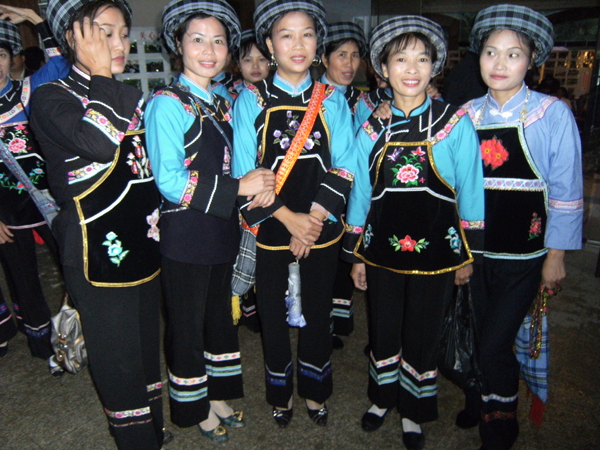 西南地區(qū)的服飾分布地區(qū)包括貴州省黔南布依族苗族自治州羅甸,黔西南州望謨、冊亨、貞豐、安龍、興義、興仁、安順市的鎮(zhèn)寧、關(guān)嶺、紫云三縣的南部以及云南省羅平等縣(市),基本上都屬于布依語第一土語區(qū)。這個地區(qū)婦女普遍穿大襟衣、長褲腳。衣服的盤肩、袖口、襟沿鑲有蘭干。褲腳為大褶邊,或藍色褲腳鑲一截青布和蘭干。衣服的長短和褲腳的大小,各地區(qū)都不相同。冊亨一帶衣服較短,褲腳短小,包花格長帕,胸頸掛彩珠項圈,手套玉石或骨制手鐲;望謨一帶青年婦女把花格帕折疊后纏戴;貞豐一帶的衣服較長,褲腳不折邊,青年和老年婦女基本相同,但青年婦女包的花帕形狀如牛角(人稱“牛角帕”);靠近北部地區(qū),衣褲都較長,而且不鑲蘭干,衣褲和帕子多為青色;安龍、興義一帶則多包白帕,衣褲亦不鑲蘭干;西南一帶地區(qū)衣褲已漸不鑲蘭干,但還穿自織的土布衣服,頭上還包花格帕,一些地區(qū)與漢族婦女裝束完全一樣了。