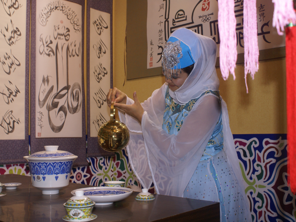 回族普遍喜歡飲茶?;刈逑让裣彩程鹌?,在中國(guó)茶文化影響下,形成了以甜味為特色的飲茶習(xí)慣。飲茶之風(fēng)興起于中國(guó)晉代,盛于唐代以后,隨之出現(xiàn)了茶具,其中以包括茶托、茶碗、碗蓋的“三坯胎”蓋碗美觀實(shí)用?;刈謇^承發(fā)展了這種茶文化,形成了以“三炮臺(tái)”為茶具的“八寶蓋碗茶”:在茶具中放入茶葉(茉莉花茶、陜青茶、紅磚茶、窩窩茶、毛尖等)、糖(白糖、紅糖、冰糖、梨膏糖等)及紅棗、核桃仁、桂圓肉、芝麻、葡萄干、枸杞(或柿餅、山楂、姜片、果干)等配料,用開(kāi)水沖制后飲用。茶葉及配料在不同的地區(qū)、不同的季節(jié),根據(jù)飲茶者的身體狀況與喜好有不同的搭配,如“紅糖磚茶”“冰糖陜青茶”“三香茶”(茶葉、糖、桂圓)、“白四品”(陜青茶、白糖、柿餅、紅棗)、“紅四品”(磚茶、紅糖、紅棗、果干)、“五味茶”(綠茶、山楂、芝麻、姜片)等。八寶茶具有生津解渴、開(kāi)胃健脾的作用,放入不同的茶料,又具備了不同的健身康體功能。