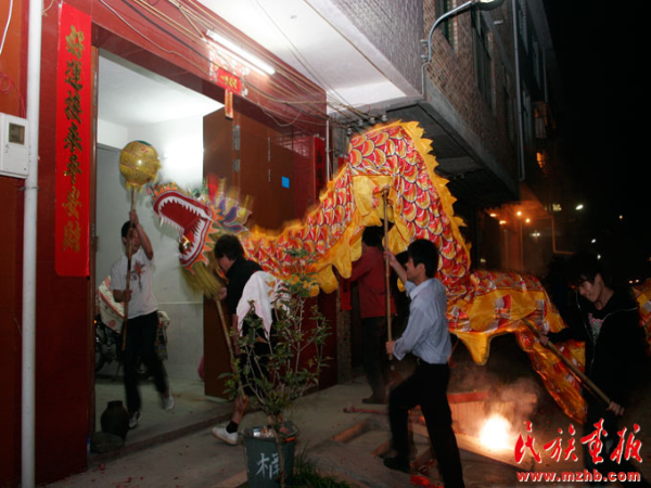 鼓聲起,鑼鼓響,鞭炮鳴。一片歡呼聲中,“龍”忽上忽下,左搖右擺地從承啟樓游出。由于五云樓是幾座土樓中最老的一座,里面還供奉著江集成及其夫人的塑像,所以拜訪從那里開始。進入五云樓,“龍”首先來到中堂,三鞠躬,敬拜祖先和觀音。然后,“龍”開始去樓里每戶家里拜訪,各家紛紛燃放鞭炮迎接龍的到來。從五云樓出來后,“龍”前往保生大帝廟參拜諸神。據(jù)記者觀察,只要途中路過寺廟佛堂和樹神所在地,“龍”都會去參拜。