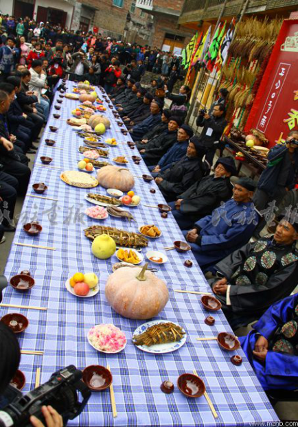 水族以大米為主食,喜愛糯食,此外,水族還種植一些小麥、包谷、小米、紅稗、紅薯及飯豆等雜糧作輔助糧。糯米飯是節(jié)慶主食,也用于祭祀,故又戲稱“鬼米”。水果有李、橙、橘、桃、梨和楊梅,還出產(chǎn)麥冬、杜仲等各種藥材。水族農(nóng)民不善種菜,因而蔬菜品種比較單調(diào),青菜、廣菜及大葉韭菜是最常見的蔬菜。水族比較重視養(yǎng)殖業(yè)和漁業(yè)。水族酸湯極有特色,有辣酸、毛辣酸、魚酸、臭酸等多種。極少有炒菜,一年四季都吃酸湯“火鍋”。即使偶有豆腐、肉或魚,也習(xí)慣加入菜中,煮成一鍋沾蘸水吃。吳茂釗《水族食俗點(diǎn)滴》一文指出,輪流坐莊就是熱情好客的文化表露。水族宴席上以雞、鴨、豬頭為尊,特別喜歡吃魚。水族特色飲食還包括水族特制的豬頭、豬腿、雞、鴨腿、糯米飯、粽粑、魚包韭菜、煮活魚等美食。對于水族人民而言,“吸煙重于喝茶,飲酒重于吃肉”。水族婚、喪、壽宴簡易,有“吃酸”的習(xí)俗(圖為水族節(jié)日盛宴。席間的“魚包韭菜”是祭祖儀式的必備之菜。引自民族畫報(bào))。