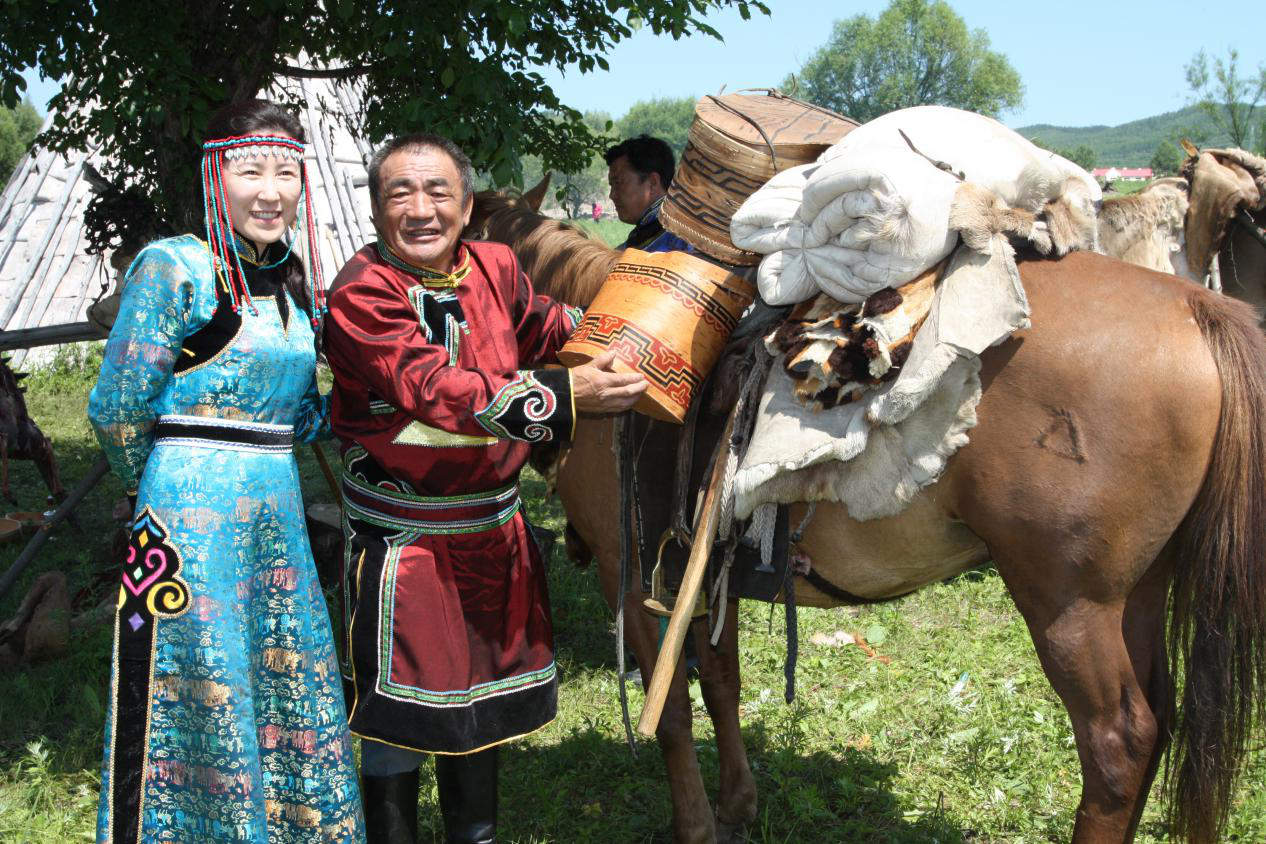 訂婚以后,女方家要為姑娘準(zhǔn)備嫁妝,嫁妝屬于女方私有財產(chǎn),小兩口可以任意支配,別人無權(quán)干涉,故嫁妝多陪送雌馬,因?yàn)榧迠y馬繁殖的小馬也屬于嫁妝。嫁妝中還有一個制作考究的樺樹皮箱絕對不能少,這個樺樹皮箱鄂倫春語叫“阿達(dá)瑪拉”,有長方形和橢圓形兩種。箱蓋中央刻“南綽羅”花紋,象征夫妻相伴、團(tuán)結(jié)美滿。箱蓋邊沿和箱子四周刻有“奎熱格音”圖案,代表著娘家對女兒的告誡:嫁了人就要忠于丈夫,不能隨便超越規(guī)范。