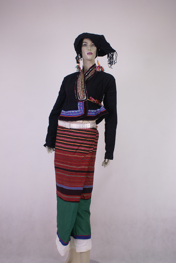 婦女的衣裙與傣族相似,上穿緊身短衣,頭頂挽髻,用頭巾纏頭,喜歡戴大耳環(huán)、銀手鐲等裝飾。姑娘愛戴野花或自編的彩花,將雙頰染紅。一般,女子上著左右兩祚斜襟窄袖黑色小褂,小褂為圓領、緊腰、寬擺,短及臀部,在左肋下拴線打結,已婚婦女用黑色布料,未婚姑娘喜淺藍色或白色。里衫為無袖貼身夾衫,下穿兩條筒裙,內裙為白色,外裙有兩色,臀部以上為紅色橫條,腿下為綠色或黑色,用布條或花邊鑲飾。未婚婦女用黑或藍布包頭;已婚婦女梳發(fā)髻,插銀簪,頂端鑲3顆棱形玻璃珠,下系銀鏈,纏包頭。婦女戴銀耳環(huán)、項圈、手鐲等飾品。