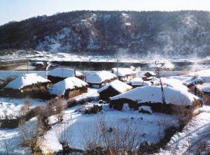 朝鮮族聚居的長(zhǎng)白山區(qū),山巒起伏,河流縱橫,村落都是背山面水,房屋坐北朝南。村落的大小主要是依開墾耕地的多少而建,街道依山勢(shì)自然形成,東西方向較長(zhǎng),村屯之間以稻田相連。