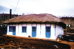 水稻的大面積種植提供了充足的稻草,它們可用于紡草繩、苫屋頂。因此,苫蓋稻草的屋頂也是朝鮮族民居的特色。四面墻壁很薄,中間立木柱,兩面釘薄板或綁扎秫秸,以草泥抹平,刷白灰。每個(gè)窗、門兩側(cè)依木柱成框,并刷藍(lán)色,后墻只留一門,不設(shè)窗。間壁墻上架柁,柁上搭檁木、鋪椽子,再鋪秫秸,鏝一層黃泥,即成屋頂。從屋頂四周。