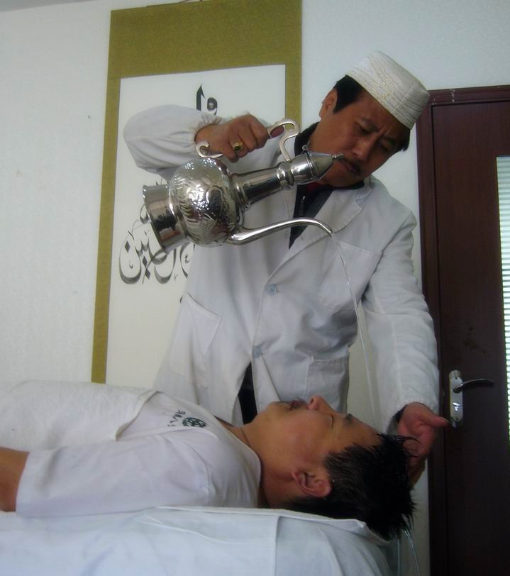 湯瓶八診療法,包括頭診、耳診、面診、手診、腳診、骨診、脈診、氣診八種療法,與現(xiàn)代經(jīng)絡(luò)學(xué)有相同的哲學(xué)思想。因人而異,運(yùn)用不同的經(jīng)脈、竅穴診療。它主要是依據(jù)回族醫(yī)學(xué)基本理論,運(yùn)用湯瓶水浴、末稍經(jīng)絡(luò)根傳法、放血、刮痧、火罐等湯瓶的基本手法,并結(jié)合穆斯林視為神圣的“杜阿伊”,分別作用于受施者身體的不同部位,操作者通過(guò)受施者的各種反應(yīng),即可判斷疾病之所在,進(jìn)而調(diào)整施術(shù)的治療手法、輕重程度和次序頻率等,從而使受施者達(dá)到提高免疫機(jī)能、防病治病的目的。