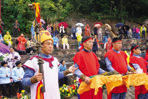 煙雨迷蒙中,頭飾百合花的童男童女,手捧水果籃的少男少女,以及身著傳統(tǒng)服飾的老年男女等,在祭師的帶領(lǐng)下魚貫進(jìn)入祭祀場。