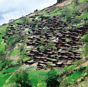 在怒江上游峽谷聚居的傈僳村寨都建在高山的半山上,其民居俗稱為“千腳落地房”。說(shuō)“千腳落地”雖有些夸張,但也足以形象地說(shuō)明峽谷溫?zé)岬臍夂蚝蜕礁咂露傅牡乩項(xiàng)l件。在雨季時(shí),“千腳”阻力最小,使山洪順利傾瀉而下,又很快干爽,免受潮氣。而且不需挖地動(dòng)土,不必移石砌墻,對(duì)木料沒(méi)有過(guò)高要求,長(zhǎng)短皆用,在生態(tài)脆弱的高山峽谷也算環(huán)保建筑?!扒_落地”是因建房時(shí)先在確定的屋基上依斜坡程度和住房面積打進(jìn)數(shù)十根到百余根木樁為基樁,以保證居室樓板的平正?;鶚洞蚝煤?,除四面留幾根高柱作為整個(gè)房屋的立柱外,在密集木樁所形成的平面上滿鋪竹篾編織的樓板,還有竹篾圍墻,所有結(jié)構(gòu)皆用竹篾綁扎。屋頂鋪苫草或蓋木片瓦,近幾年,已陸續(xù)換上了大塊的水泥波形瓦。房門開在山墻一側(cè),有廊道,可做曬臺(tái),平時(shí)穿的衣服都搭在這兒,也是婦女做針線活的地方。隨著怒江峽谷的開發(fā)和新農(nóng)村建設(shè)的深入,通路的村寨將很快會(huì)改變面貌。
