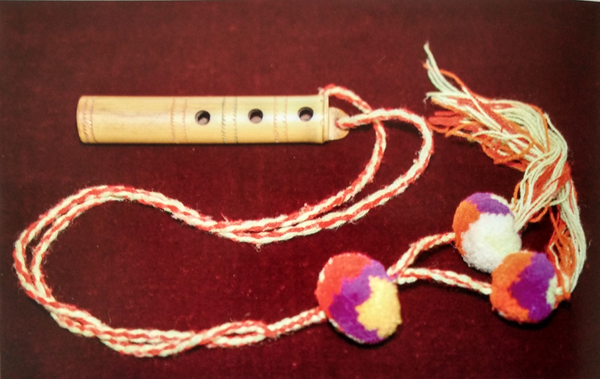 直笛,傈僳語(yǔ)稱之為“迪哩吐”(如圖),多用蘆葦制作,長(zhǎng)約5寸,有4個(gè)圓孔,3孔在正面,1孔在背面,音量較小,音色柔和動(dòng)聽(tīng),為青年男女抒情和求愛(ài)必要的工具。