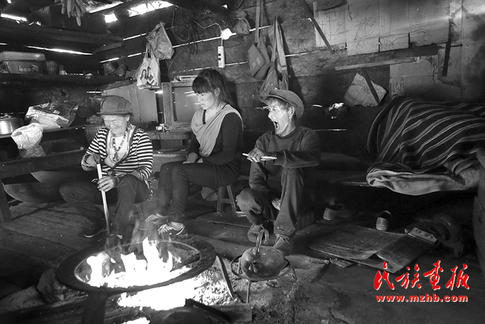 木壘房里,獨龍族一家人圍坐在火塘邊烤火